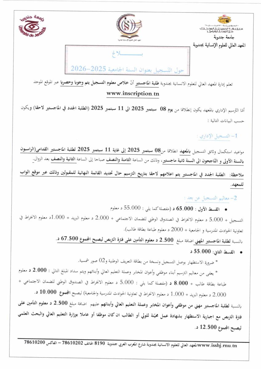 بلاغ تسجيل طلبة الماجستير للسنة الجامعية 2025-2026