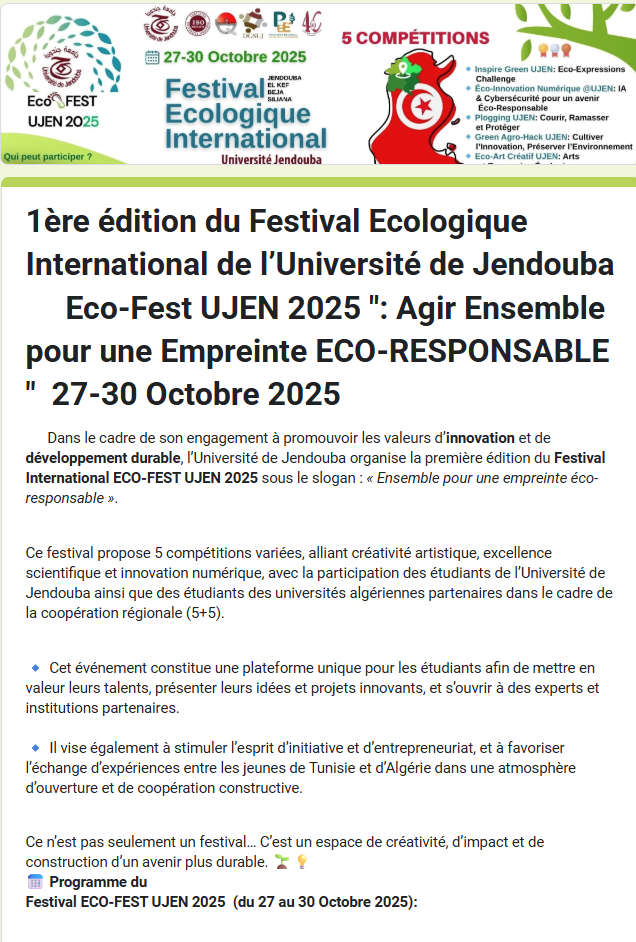 1ère édition du Festival Ecologique International de l’Université de Jendouba Eco-Fest UJEN 2025 ": Agir Ensemble pour une Empreinte ECO-RESPONSABLE " 27-30 Octobre 2025