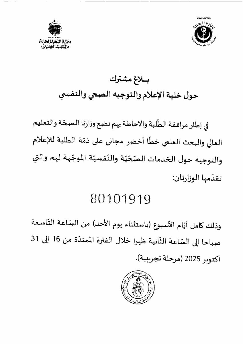 بلاغ مشترك حول خلية الإعلام و التوجيه الصحي و النفسي