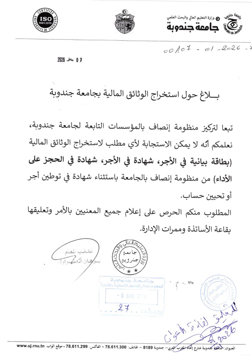 بلاغ حول استخراج الوثائق المالية بجامعة جندوبة