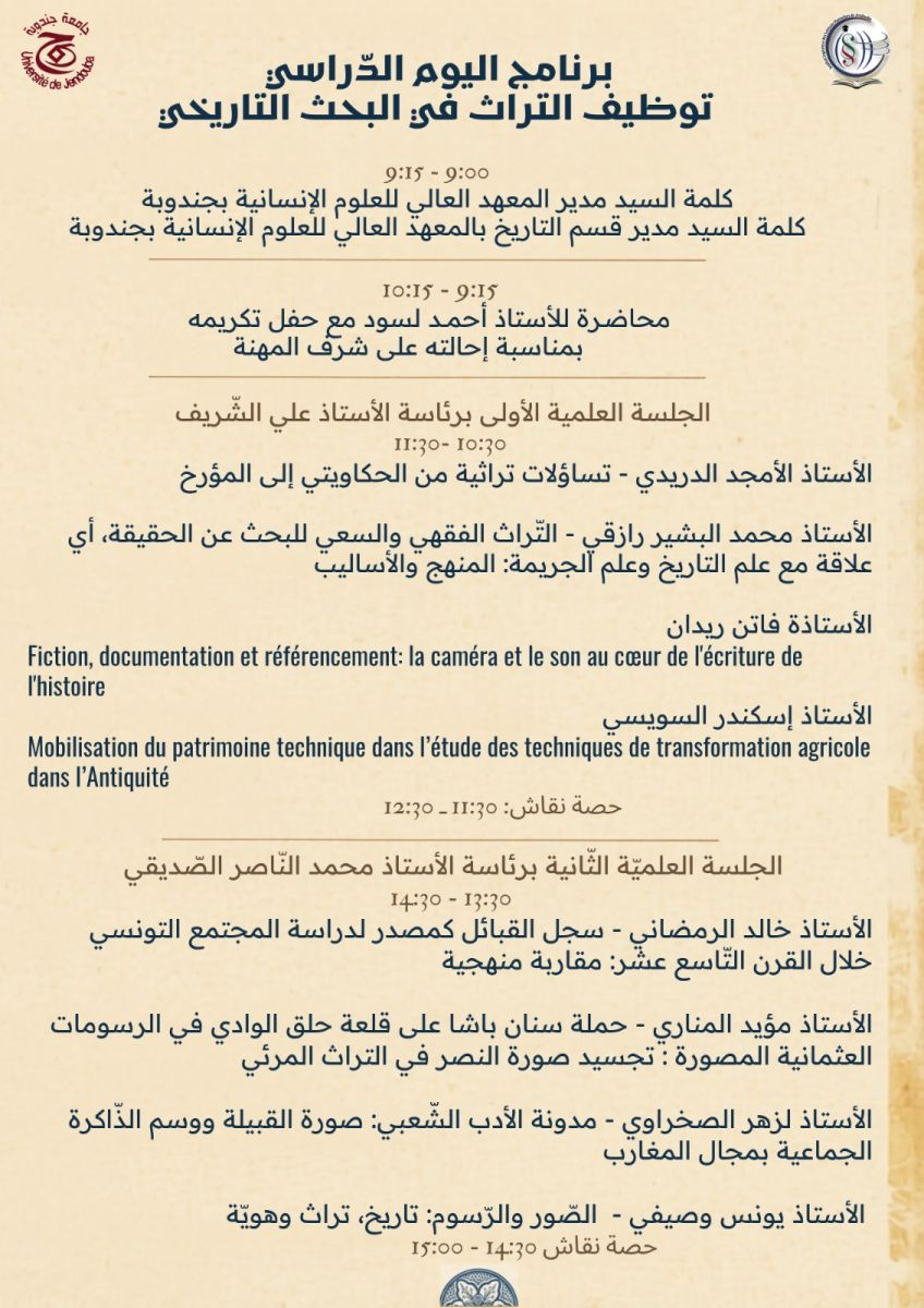 ينظم قسم التاريخ يوم دراسي تحت عنوان 'توظيف التراث في البحث التاريخي ' وذلك يوم 07 أفريل بمدرج الرحموني على الساعة 09 صباحا