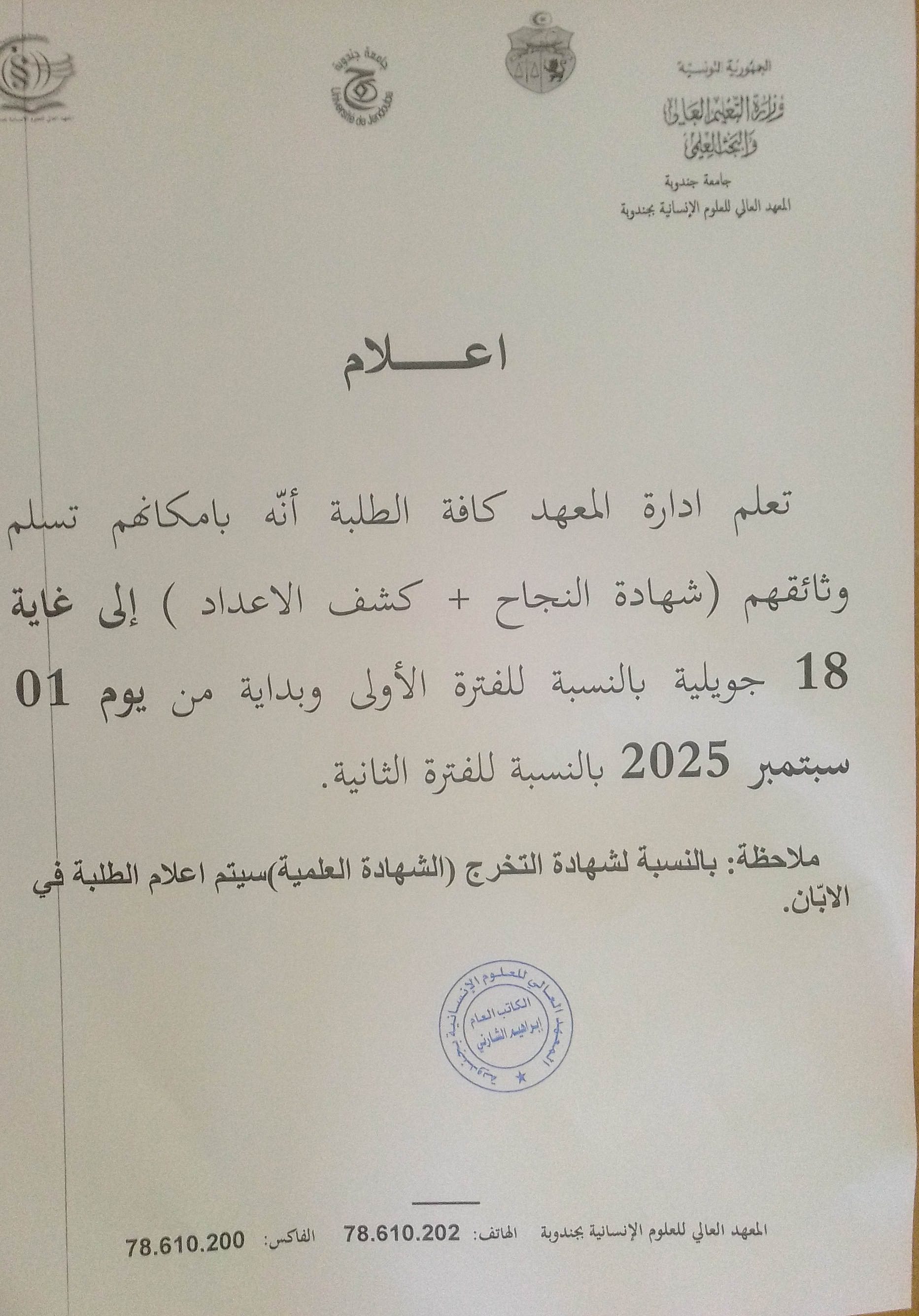 L’Institut Supérieur des Sciences Humaines de Jendouba (ISSHJ) invite les étudiants titulaires